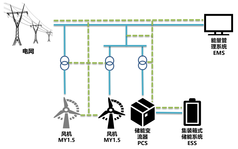 分布式能源系统让能源生产靠近需求侧,根据不同场景的需求变化平衡能源供给与使用,满足多重目标的中、小型能量转换利用,实现了更加清洁、智慧、灵活和高效的能量生产和消费方式,为我国能源结构的战略性优化和能源供给侧结构改革提供了重要解决途径。大庆中丹风机储能智能发电系统主要由风力发电机组(MY1.5)、储能变流器(PCS)、集装箱式储能系统ESS、箱式变压器、配电系统、能量管理系统(EMS)以及电网等单元组成。